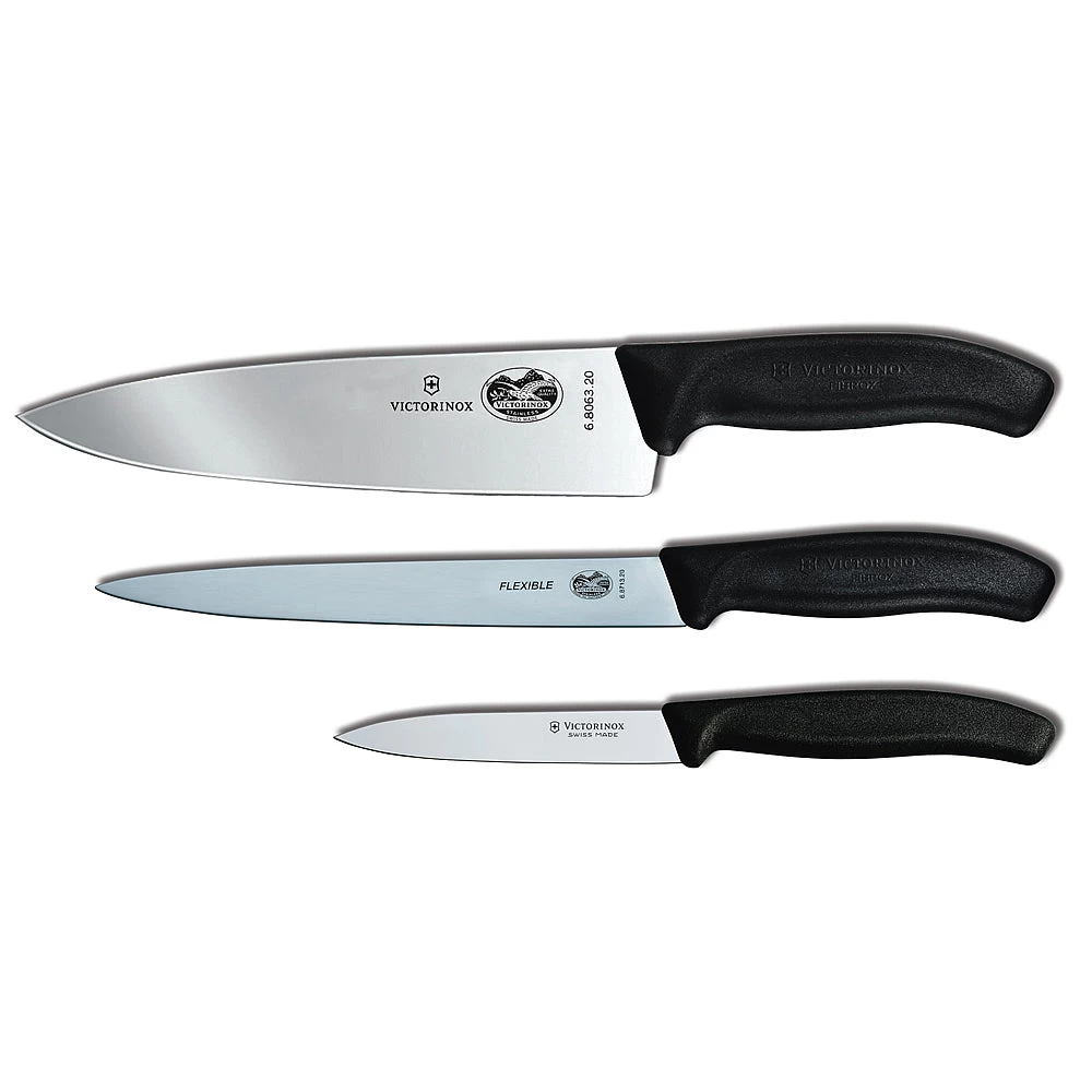 This set includes the Swiss Classic 8-inch Chef’s Knife, 8-inch Flexible Fillet Knife and 3.25-inch Parer.