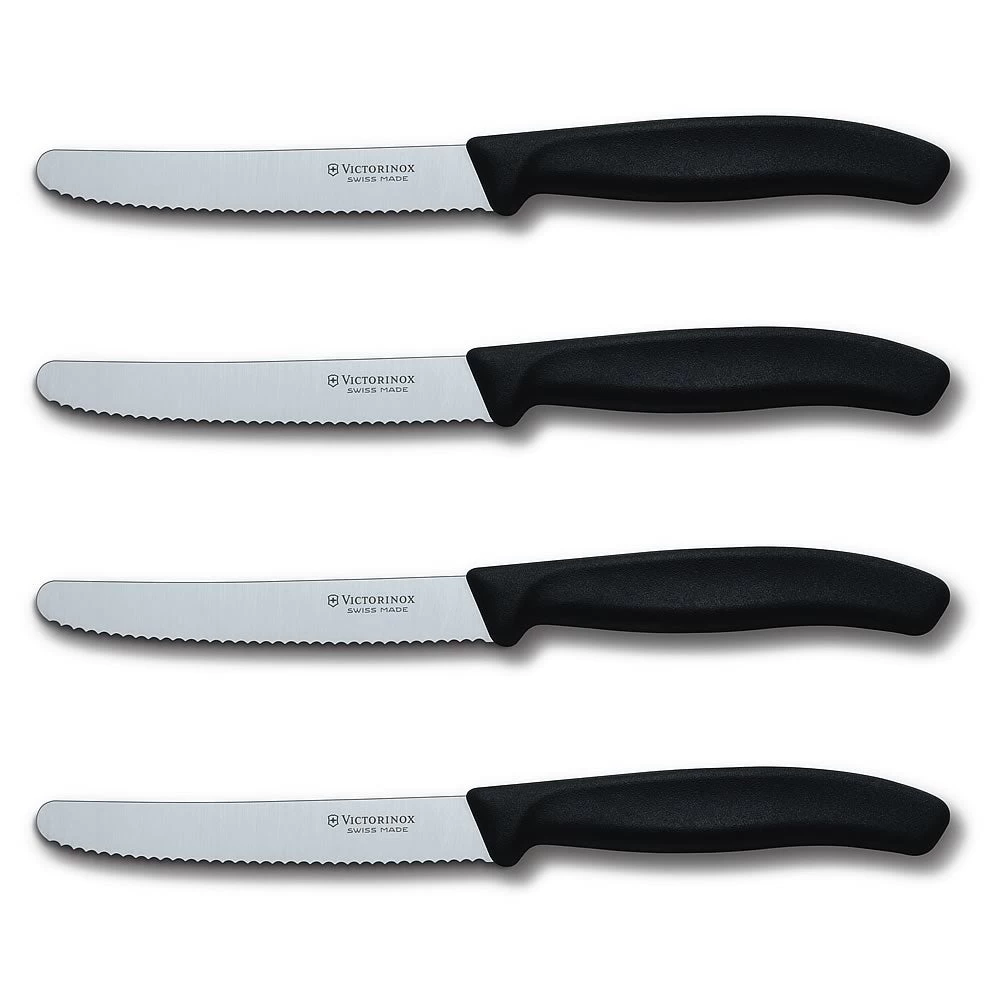 The Swiss Classic 4-Piece 4.5″ Serrated Round Tip Steak Knife Set by Victorinox features four steak knives, each with an ergonomic handle that fits nicely in your hand, as well as a sharp serrated blade that holds its edge.