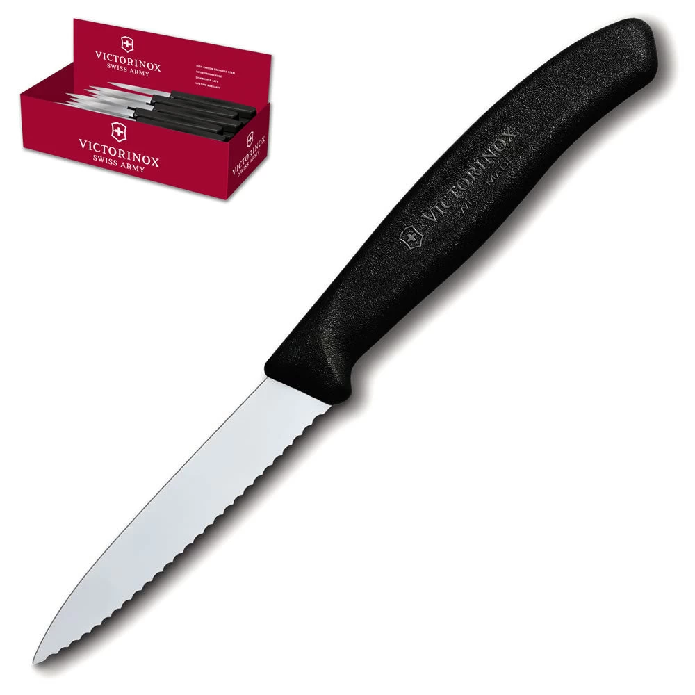 This Paring Knife Display includes 24 Swiss Classic 3.25″ Serrated Spear Tip Parers with Black Handles.