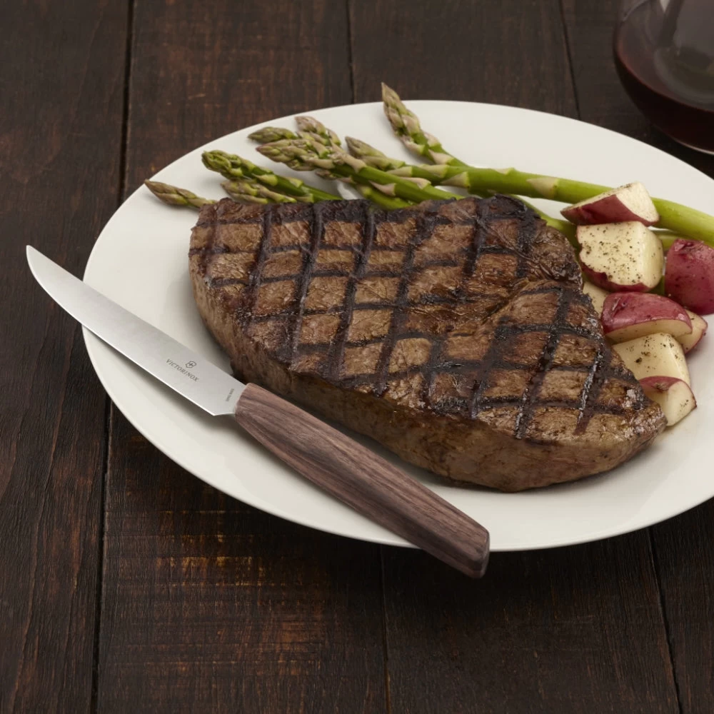 The Swiss Modern 2-Piece Steak Knife Set by Victorinox includes 2 straight edge steak knives that create clean cuts that will not tear meat, resulting in a much better dining experience. The elegant look of these knives makes them ideal for the kitchen or the dining room, and their size and shape allow them to double as paring knives.