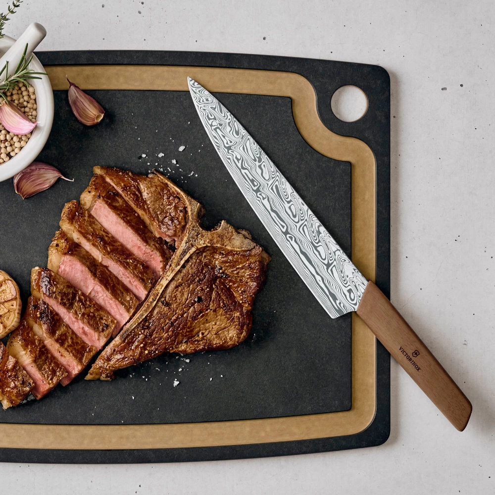 The Swiss Modern Damast Limited Edition 2022 8.5-inch Carving Knife by Victorinox is a truly unique collectible with a stunning Damast steel blade crafted in the “Thor” pattern. Damaststeel is known for its strength and beauty. The handle of this knife is hand crafted from European walnut wood, and the rich grain and deep brown color add even further to each piece’s unique look.
