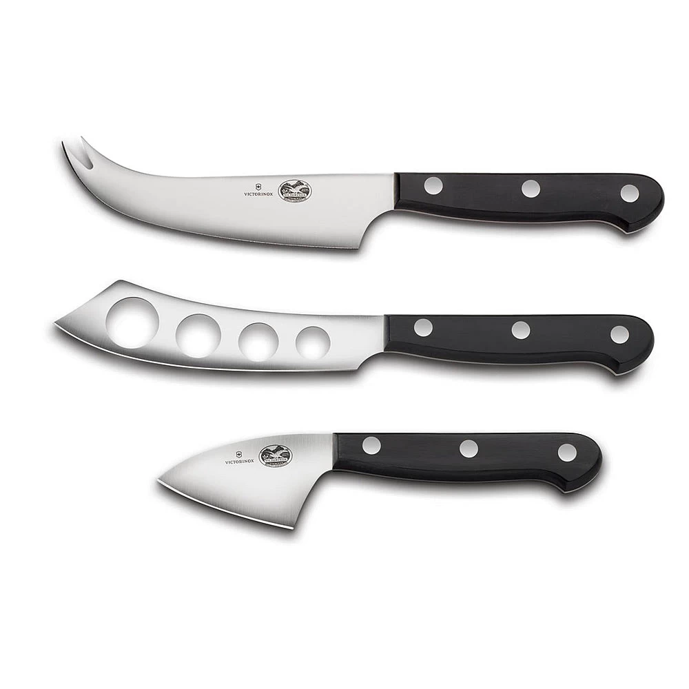 The Victorinox 3-Piece Cheese Knife Set features the three knives you need for a well-rounded cheese plate. The parmesan knife is suitable for semi-hard cheeses, and has a forked tip for picking up and serving thin slices of cheese, as well as olives and fruit. The perforated semi-hard cheese knife is ideal for cheddar and other semi-hard cheeses that stick to the blades of traditional knives. The perforations separate the cheese from the blade, and allow it to fall of the blade effortlessly. Finally, the soft-cheese knife easily cuts through rinds on cheeses such as brie without crushing the soft cheese inside. The shape of the blade also makes this knife well-suited for spreading soft cheeses onto crackers.