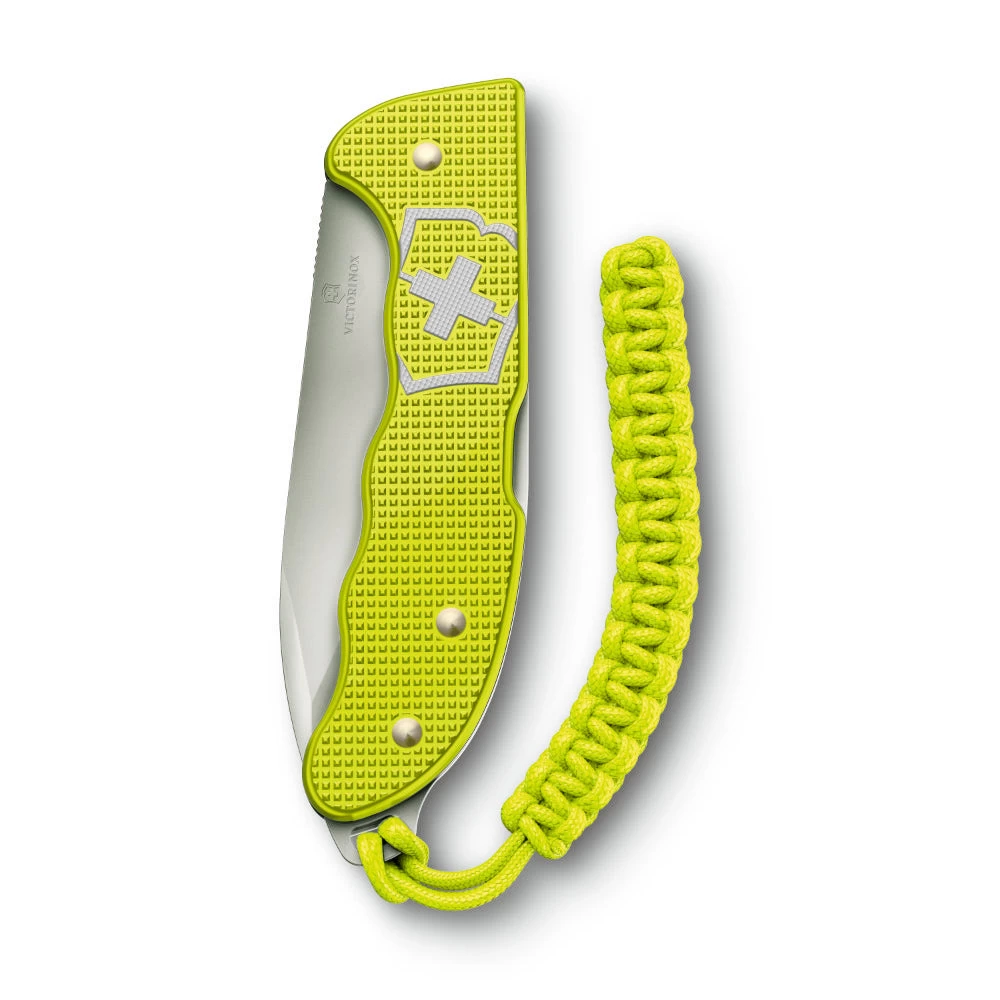 The 2023 Electric Yellow Hunter Pro Alox Limited Edition Swiss Army Knife by Victorinox provides one essential blade and is designed for easy blade access. The heavy gauge stainless steel pointed blade locks securely into place for safety until the release is pressed.