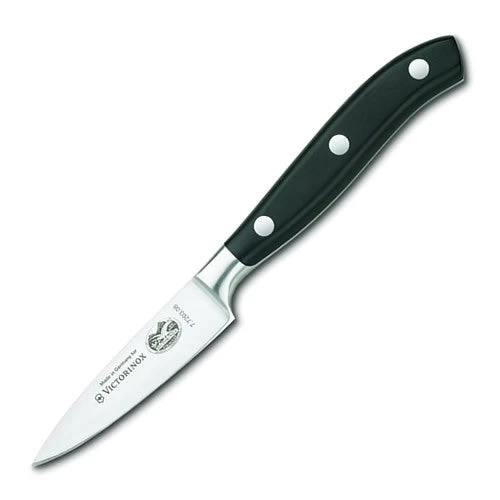 The Grand Maitre 3-inch Paring Knife by Victorinox is a very versatile parer used as a mini chef’s knife. It is perfect for slicing and dicing small ingredients such as garlic, and is also used for peeling and other in-hand work as its small size facilitates precision. It features beautifully balanced, perfectly weighted full tang construction, an intuitively engineered comfortable handle, and a no stain high polished forged steel blade with an edge that will retain its razor sharpness.