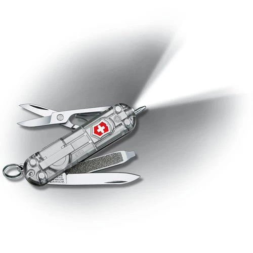 The handy Signature Lite Swiss Army Knife by Victorinox is a close relative to the Original Swiss Army Classic, with the addition of a retractable ball point pen and LED light. The key fob makes it easy to clip to your key ring, making this knife a convenient take-along.