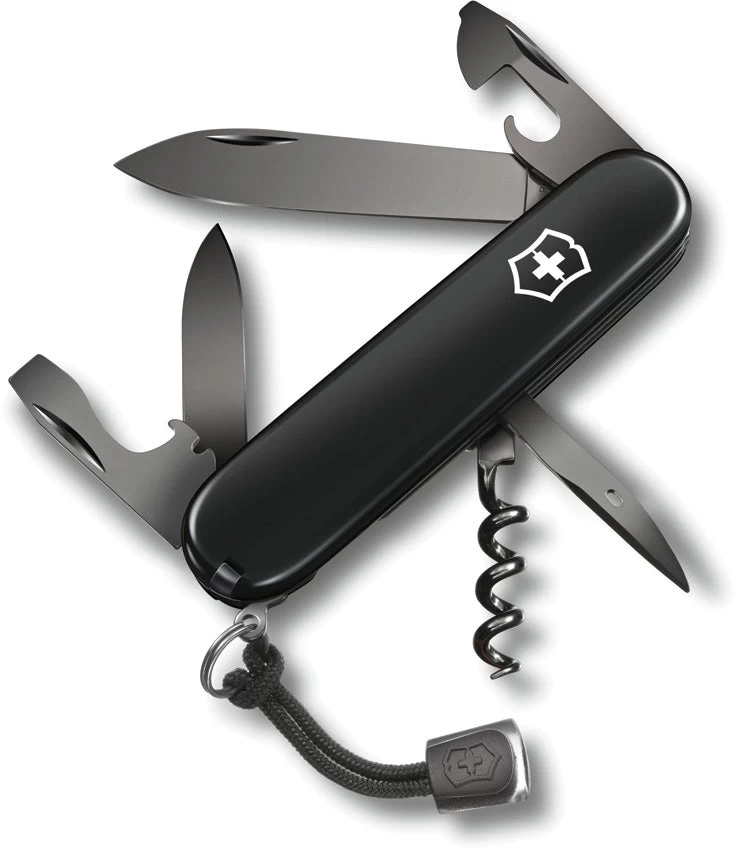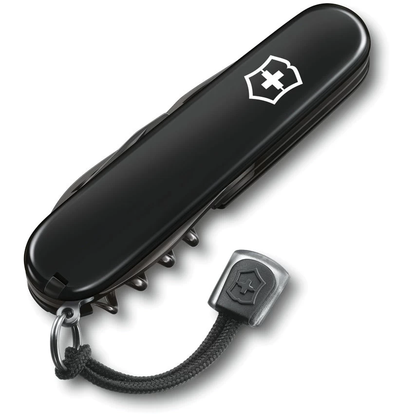 3.63″ (9.22cm) closed. Black ABS handle. Tools include: Large blade l Small blade l Can opener l Small screwdriver l Bottle opener l Wire stripper l Awl l Reamer with sewing eye l Corkscrew l Keyring l Screwdriver tip. Black Onyx finish tools. Gift boxed.