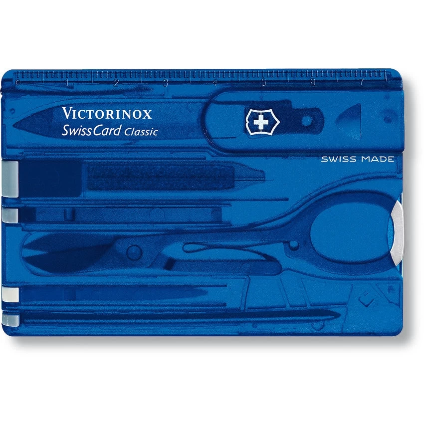 3″ (7.62cm) closed. Blue translucent ABS handle. Tools include: File l Screwdriver tip l Toothpick l Tweezers l Pen l Scissors l Metric ruler l Standard ruler I Stainless pin I Letter opener. Boxed.