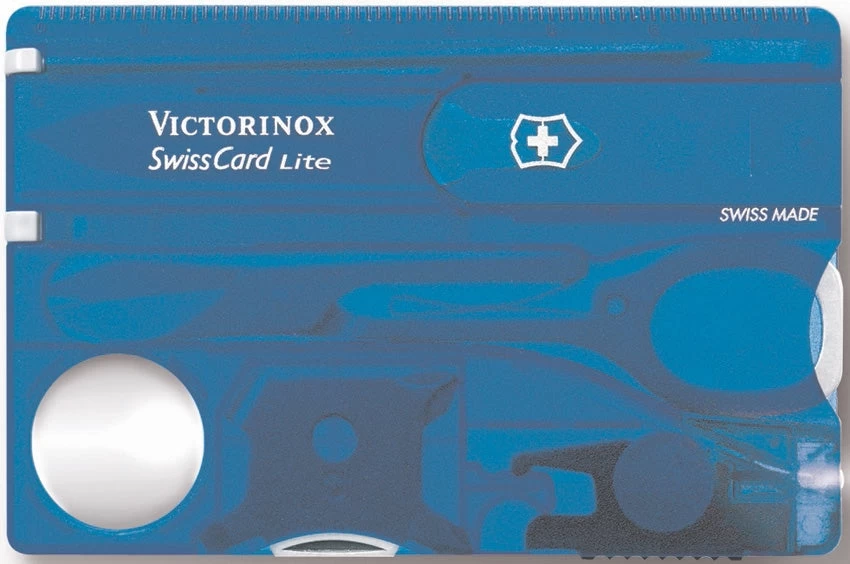 SwissCard Lite. Dimensions: 3.25″ x 2.13″. Blue ABS handle. Tools include: Large screwdriver l Light l Magnifying lens l Pen l Phillips screwdriver l Ruler l Scissors l Small screwdriver l Tweezers. Letter opener. Straight pin.