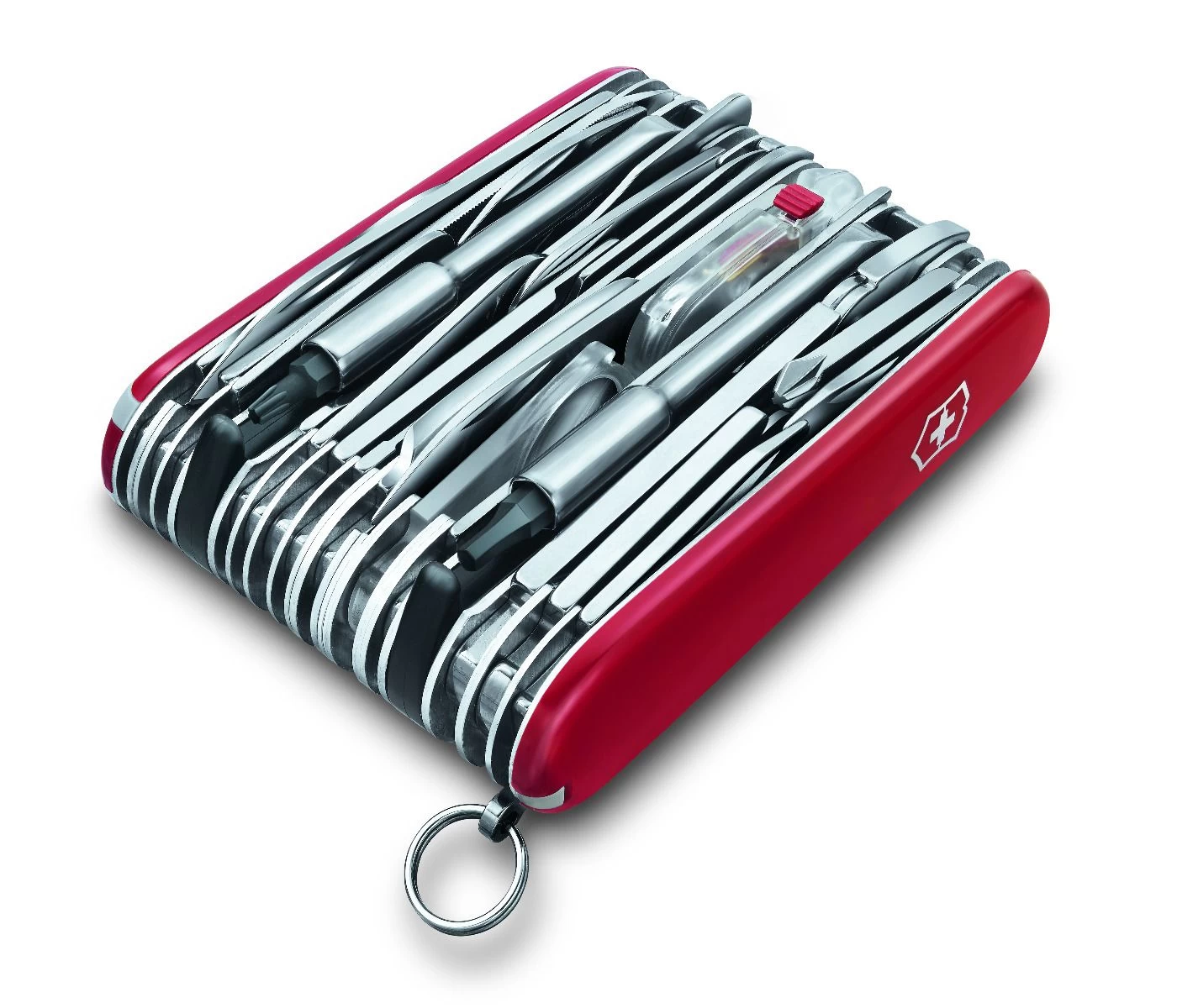 Victorinox AG guarantees all knives and tools to be of first class stainless steel and also guarantees a life time against any defects in material and workmanship (save for electronic components 2 years). Damage caused by normal wear and tear, misuse or abuse are not covered by this guarantee. It is evident at first glance that the SwissChamp XXL is much more than a ‘usual’ pocket knife. With 73 different functions it gives the term ‘all-rounder’ a whole new meaning. This super tool combines numerous quality tools with an award-winning design and comes in a high quality leather box. The second magnifier has been replaced with a spanner adapted for the tightening and the untightening of threaded nuts M2,5 to M5. Size: 91 mm, 14 layers.